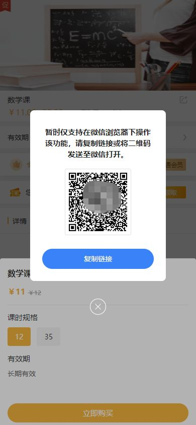 2.微信外浏览器打开暂不支持帐号相关功能,涉及帐号相关的功能,均提示前往微信中使用。比如,点击购买课程按钮,具体如下图表现: