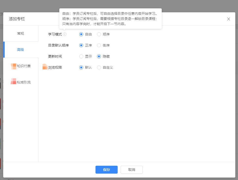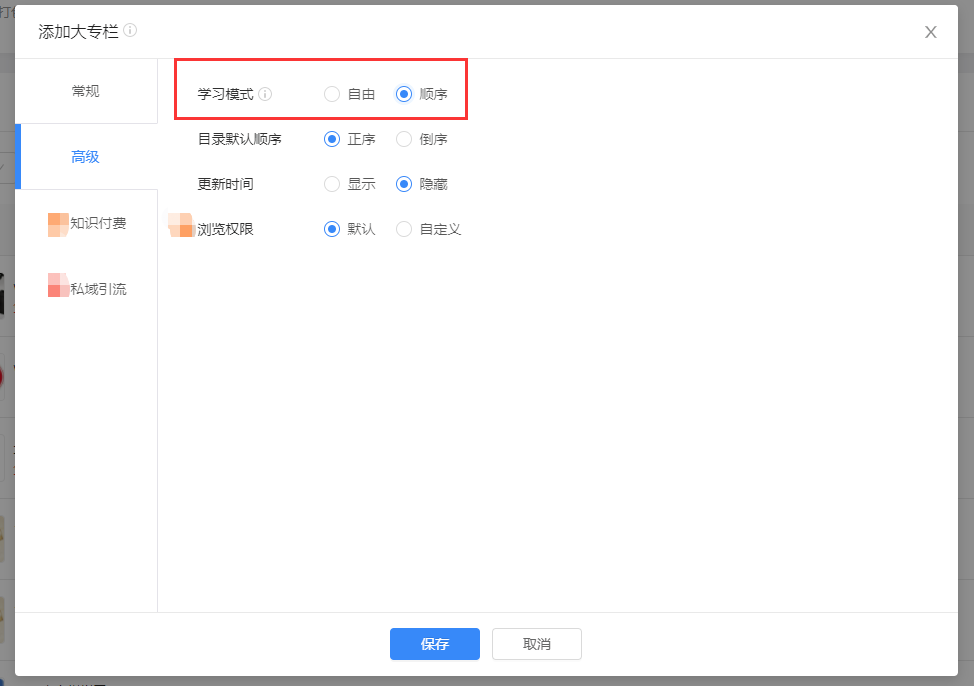 在“普通专栏的创建/编辑弹窗”中,“高级设置”新增“学习模式设置”,如下: