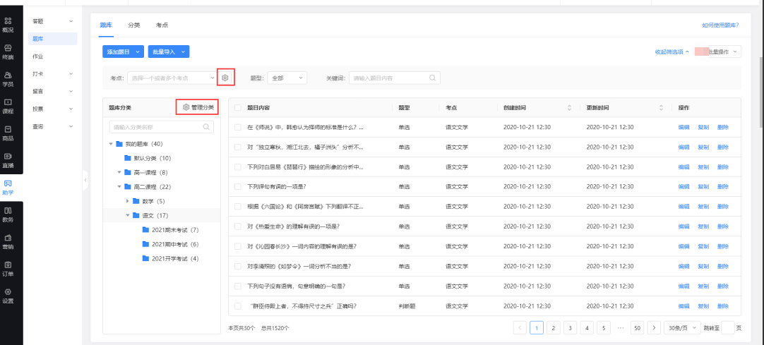 多处新增考点、分类的管理入口;