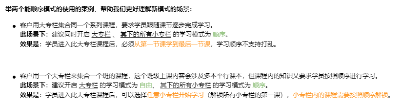 开启顺序后,将会强制要求订阅此课程的学员按照专栏课节序列进行解锁,即学完课节1才能学习课节2。顺序模式下,支持客户在普通专栏中 定义“练习”、“考试”活动的已学完标准(或者说过关标准),如下: