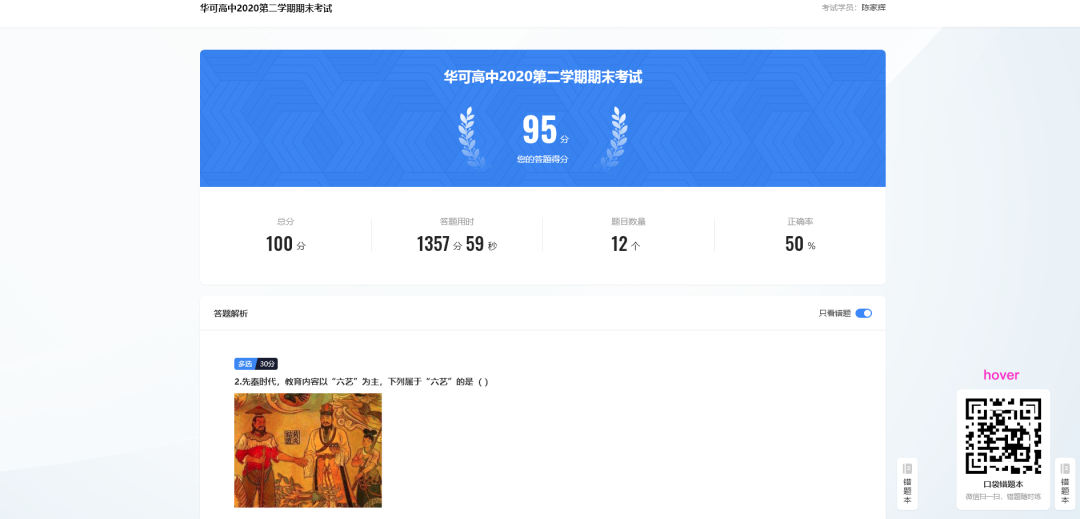 ② 口袋错题本学习指引:当开启为“只看错题”时,页面右下角会出现“错题集”的入口,支持学员通过微信扫码,快速在手机上查看个人错题。