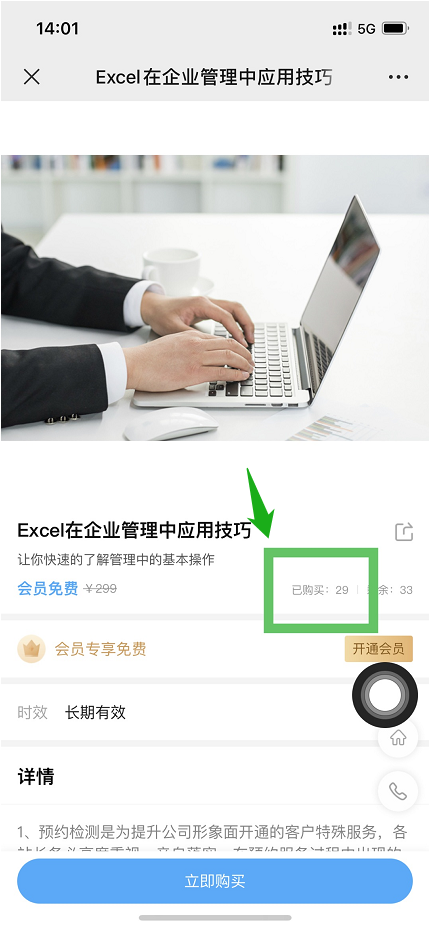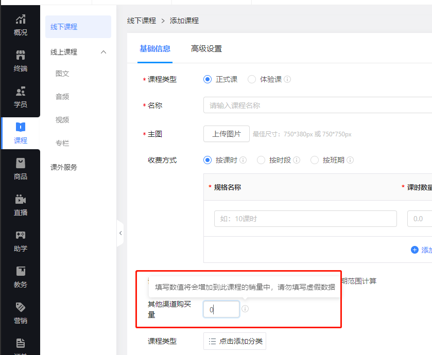 包括线下课程、实物商品(线上课程已支持)。以线下课程为例,如下图,添加/编辑课程时,可设置“其他渠道购买量”。设置的数量将累计显示在商品展示的销量中。
