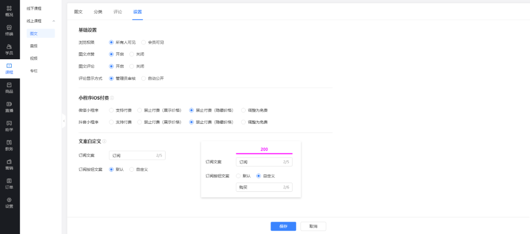 支持自定义按钮文案和订阅字眼文案。设置更改保存后,系统将会调整学员端相关文案展示,并不会影响后台相关提示、设置项。
