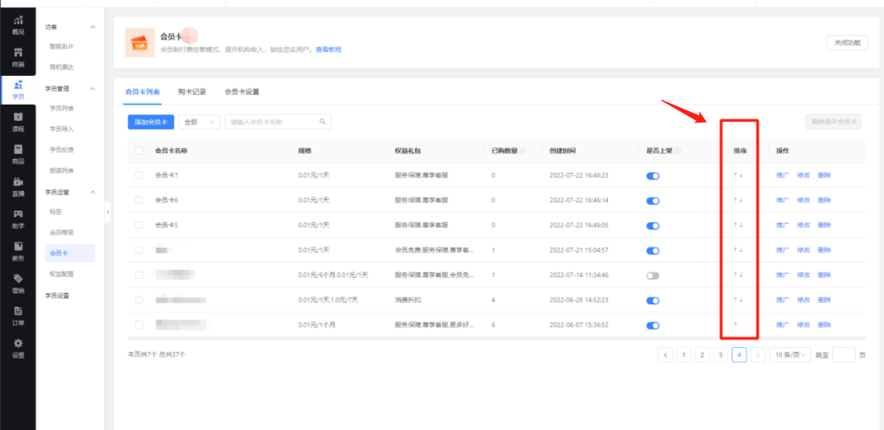 如下图,支持自定义会员卡列表排序。自定义排序将同步学员端会员卡列表页面排序。