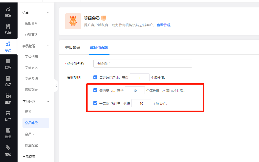 管理后台→学员运营→会员等级
