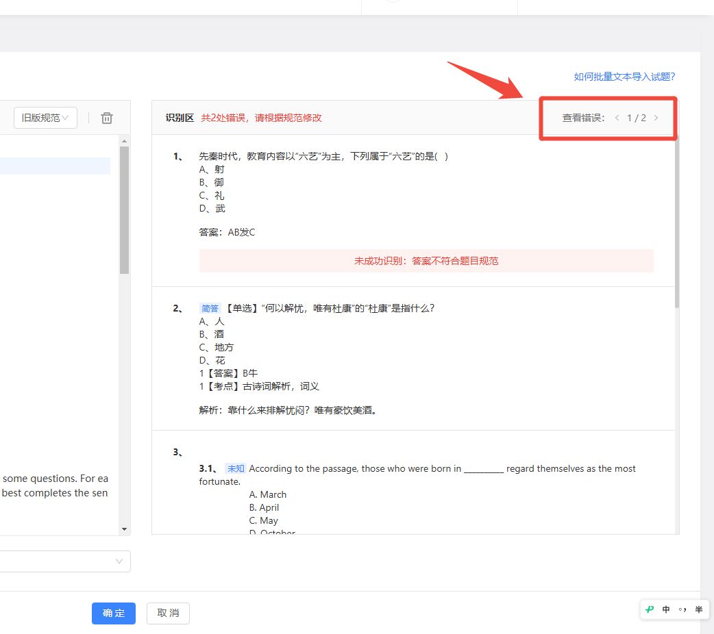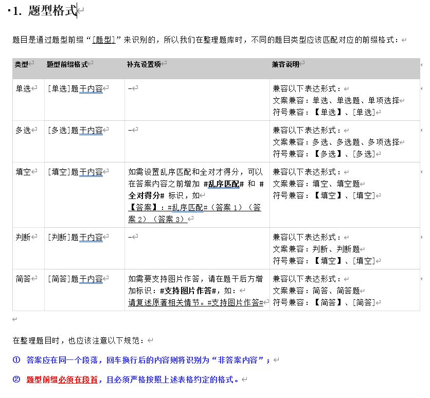 新版规范以题型前缀作为题目识别,支持解析、考点内容换行。