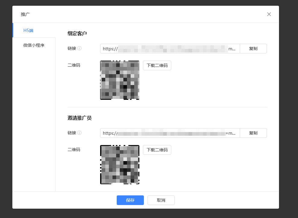 2、管理端新增推广员专属推广链接(商家为员工/推广员下载打印推广码,作为线下推广物料)