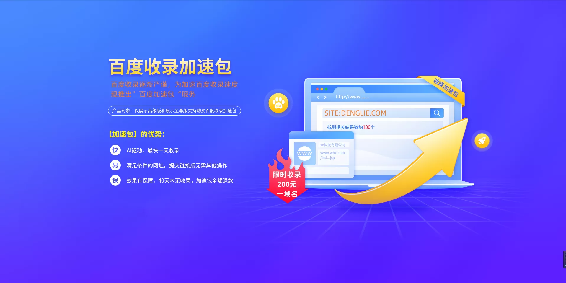 一、产品效果百度加速包:提交百度收录效率,最终达到能在百度搜索引擎中有搜索结果。二、相关说明【版本】展示高级版【注意】购买一次收录包仅针对单个开启301的站点,如有多个站点需要使用,需购买多个收录包三、设置要求前置条件:域名未过期、已绑定到站点 且 站点版本符合要求1. 未收录的域名为主域名在管理后台【网站域名】中设置未收录域名为主域名。2. 域名可以正常访问要使用百度收录加速包域名需可以正...