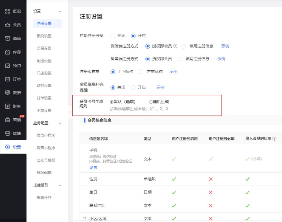 1、注册设置新增“会员卡号生成规则”设置