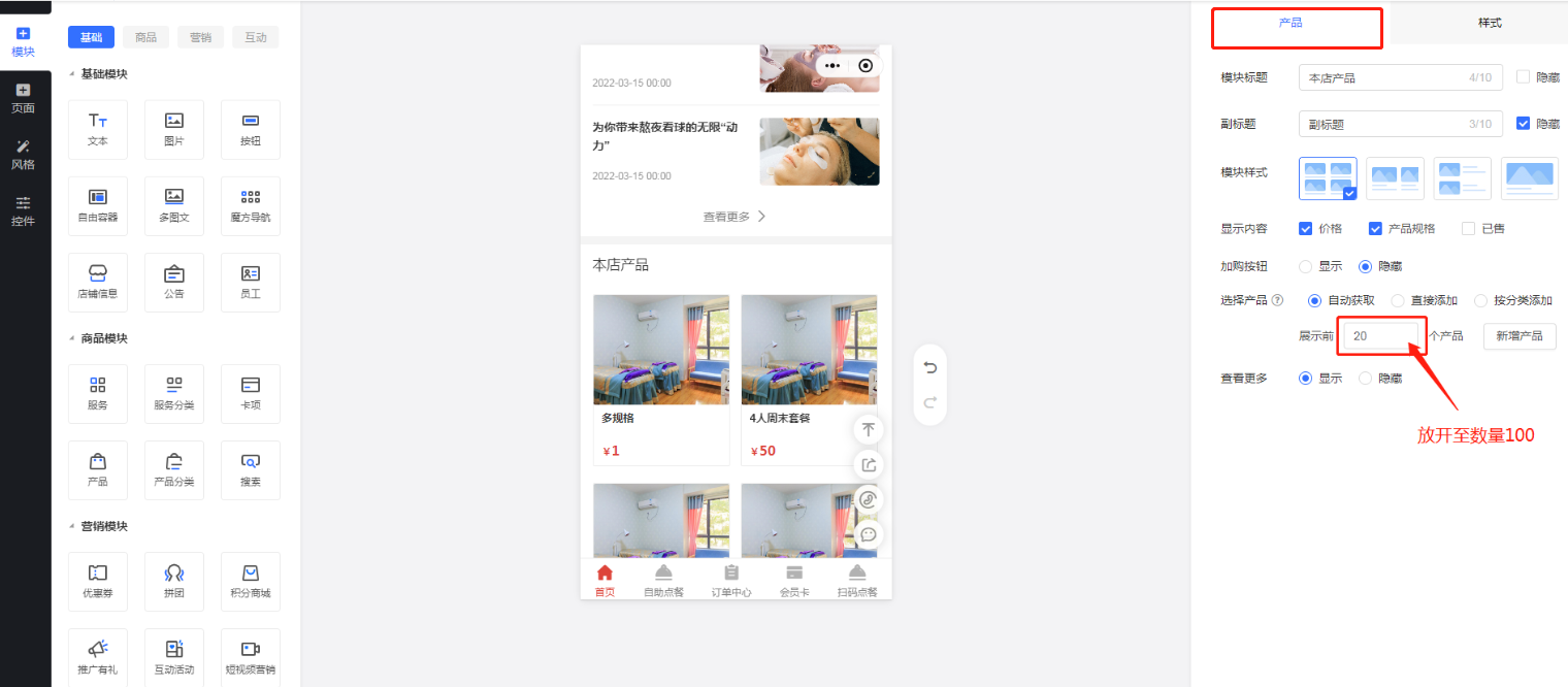 门店产品和服务相关模块现已开放数量限制,满足商家展示需求