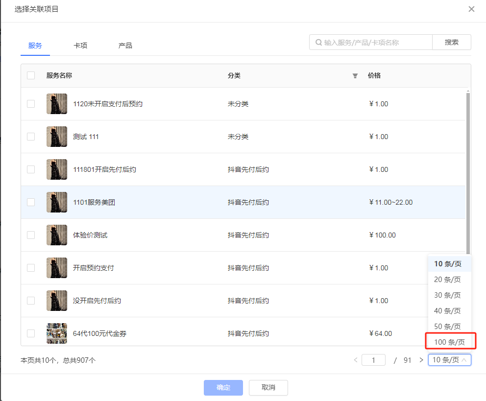 惠券/卡项/等级折扣场景下关联项目弹窗,每页显示数量增加“100条/页”