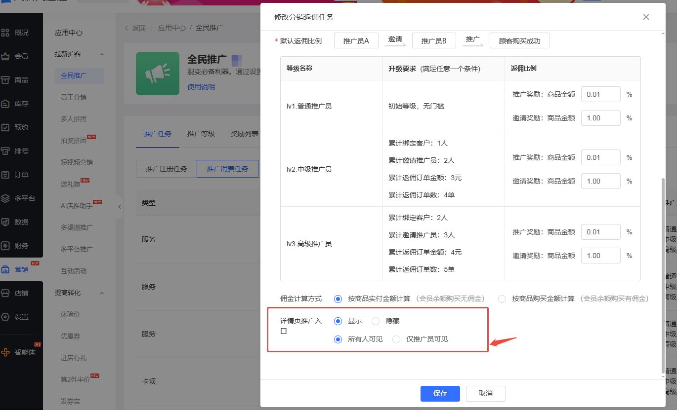 ②详情页入口:选择显示后,设为 “仅推广员可见”,仅符合门槛的用户能看到推广入口;设为 “所有人可见” 则全部用户可查看。