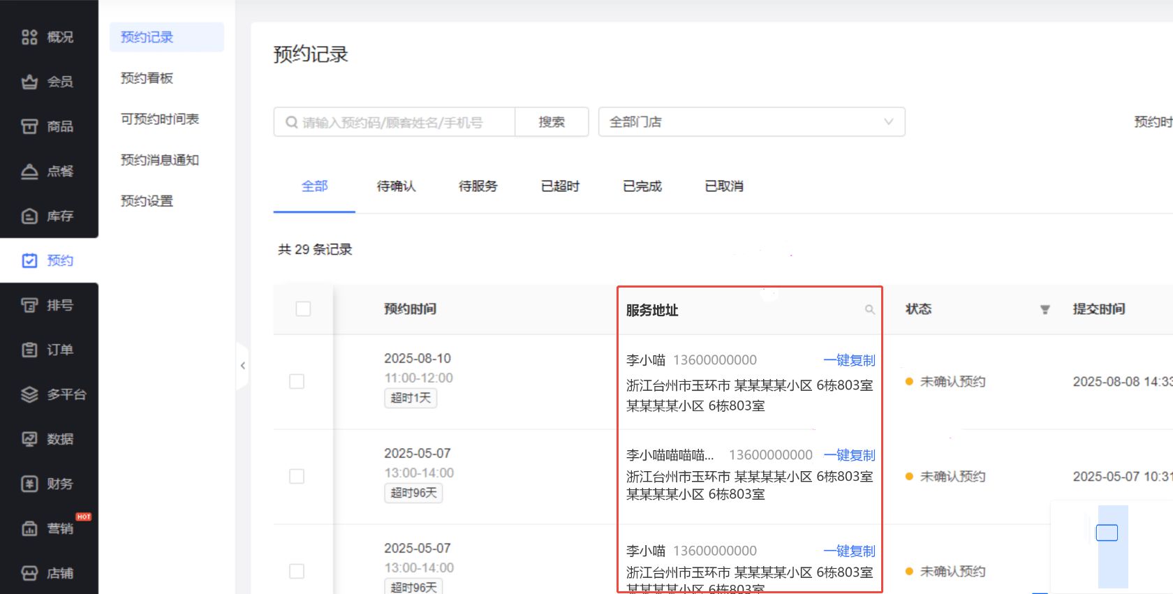 上门预约模板下,预约列表内支持查看和筛选服务地址