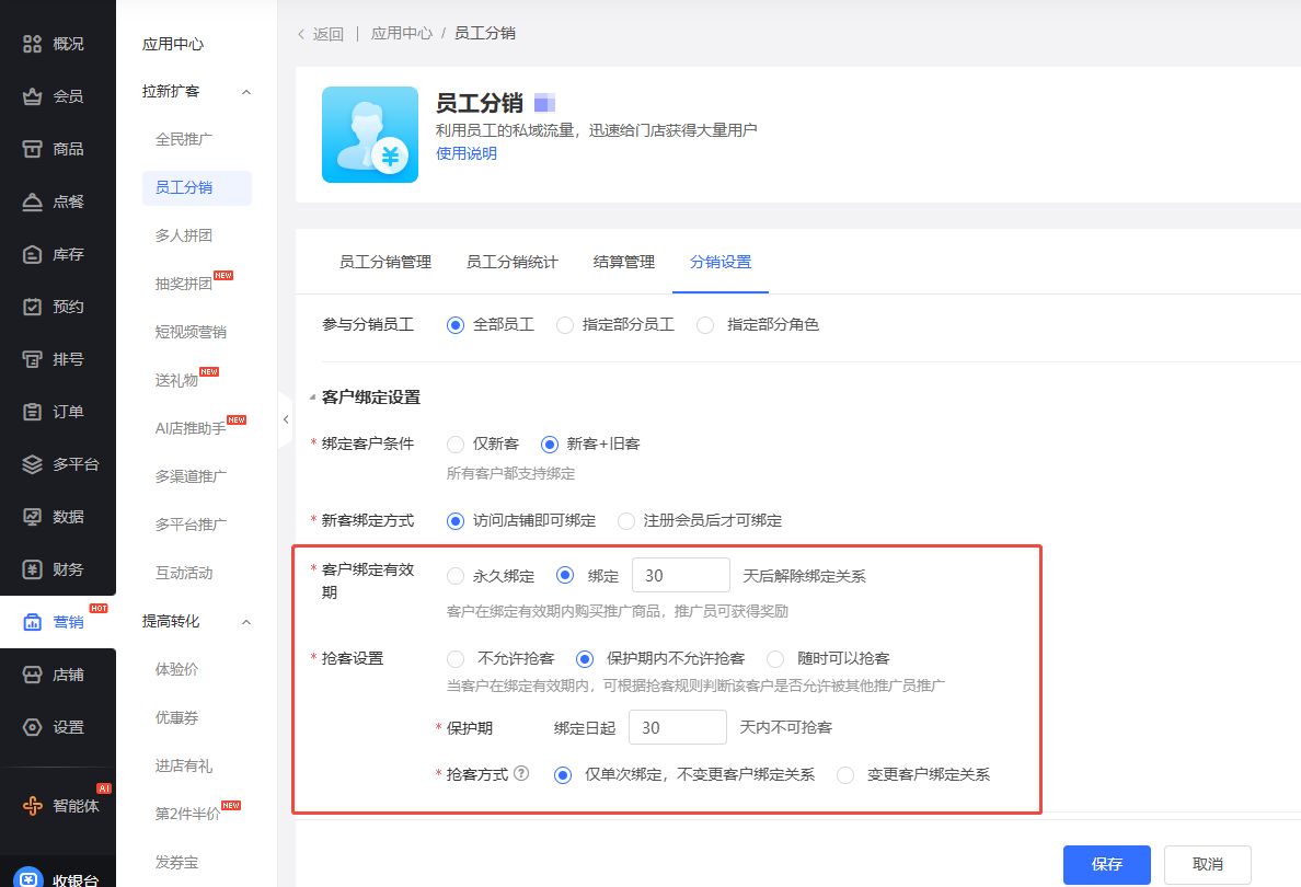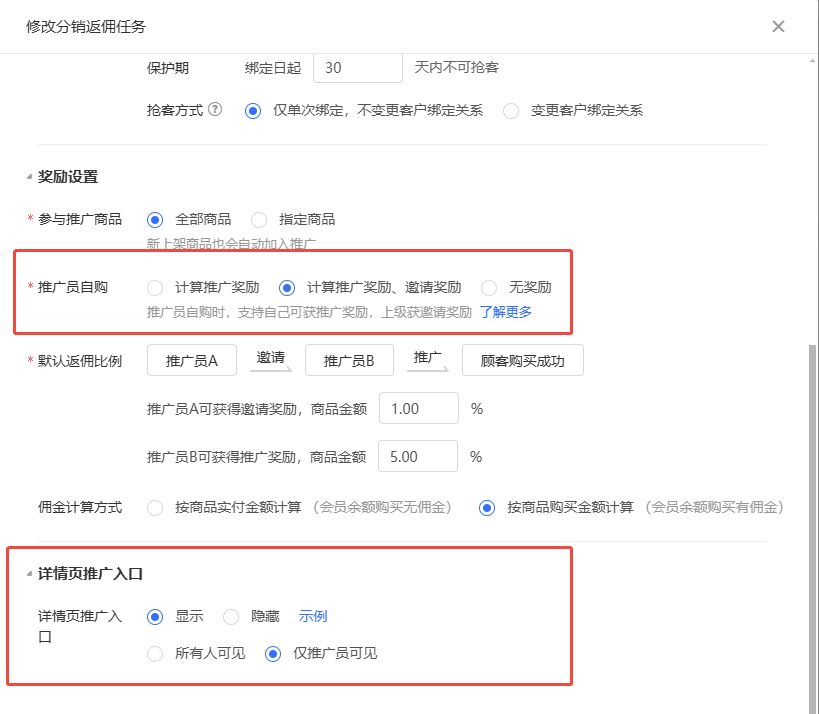 1.全民推广-分销返佣任务支持设置绑定有效期、抢客设置、自购返佣等