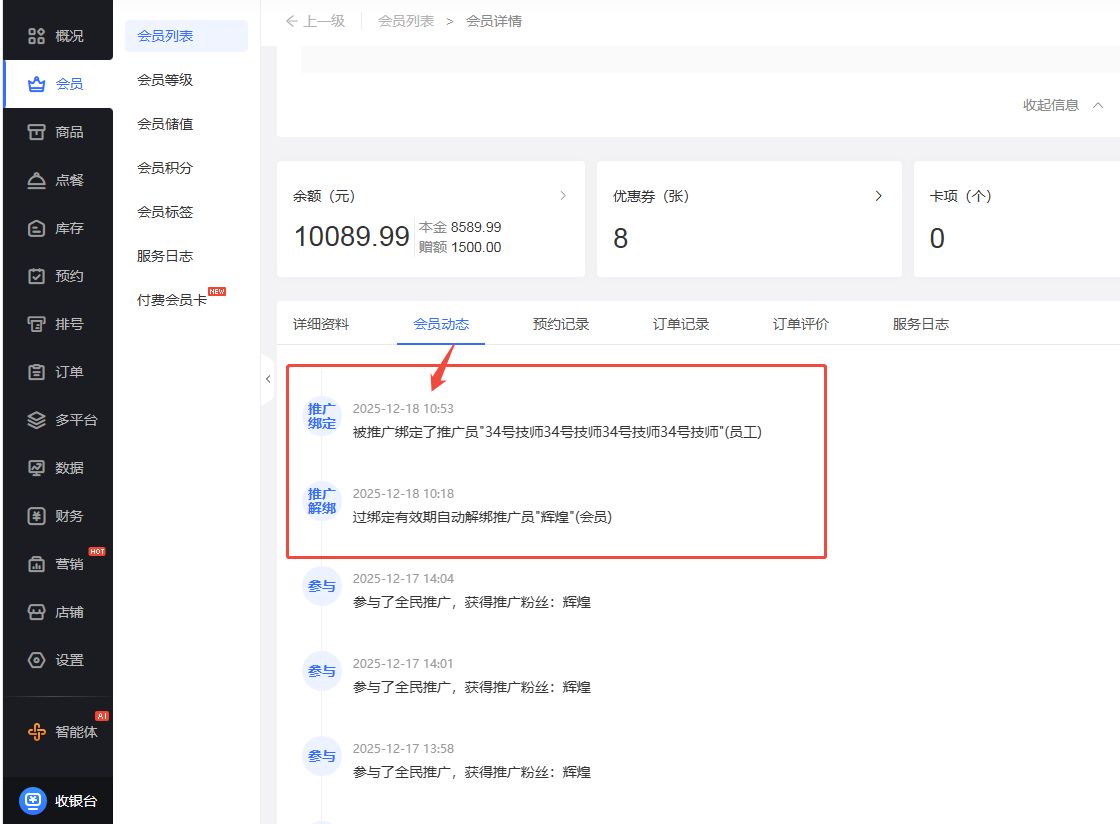 3.会员动态和操作日志支持查看推广员绑定记录